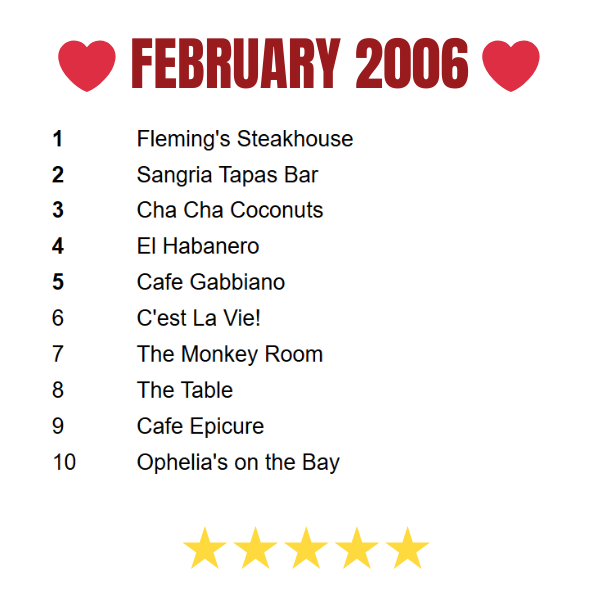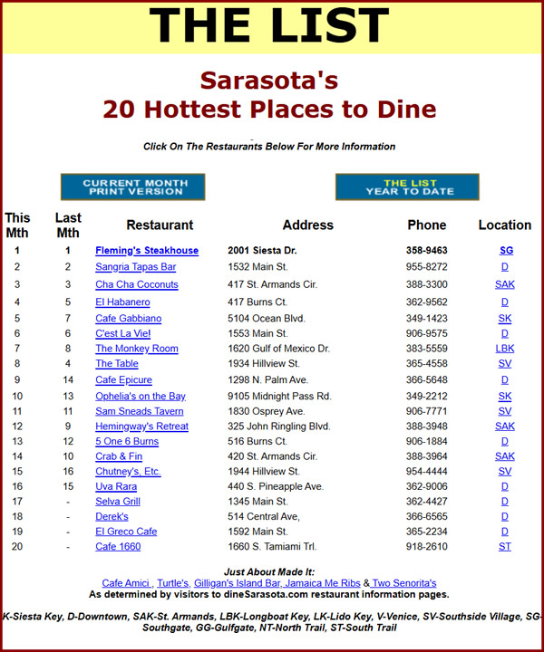 Astoundingly, six out of the Top Ten are still open and serving hungry Sarasota diners! That is quite a feat. Let’s give those half dozen a nice round of applause. 👏